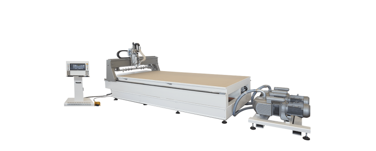El sistema de bloqueo para el material que se está mecanizando, generalmente en hojas, utiliza un sistema de vacío, cuya instalación está completamente integrada en el marco de la máquina.